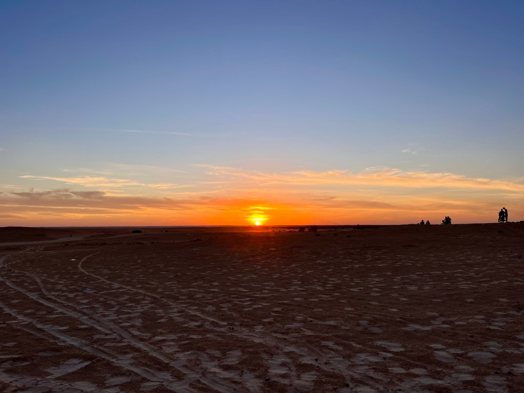 Là où nous allons, notre bus ne peut pas s’aventurer. Alors nous l’échangeons contre un 4×4, et nous nous enfonçons un peu plus dans le Sahara. Notre chauffeur fait des folies. Il enclenche la musique underground et nous fait prendre des descentes à pic dans les dunes… On a adoré.
